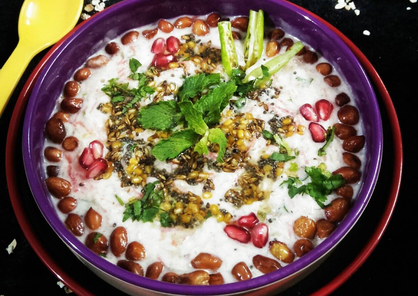 - In a tempering pan heat oil. add peanuts and roast for a min.add roasted peanuts to curd oats bowl and mix.