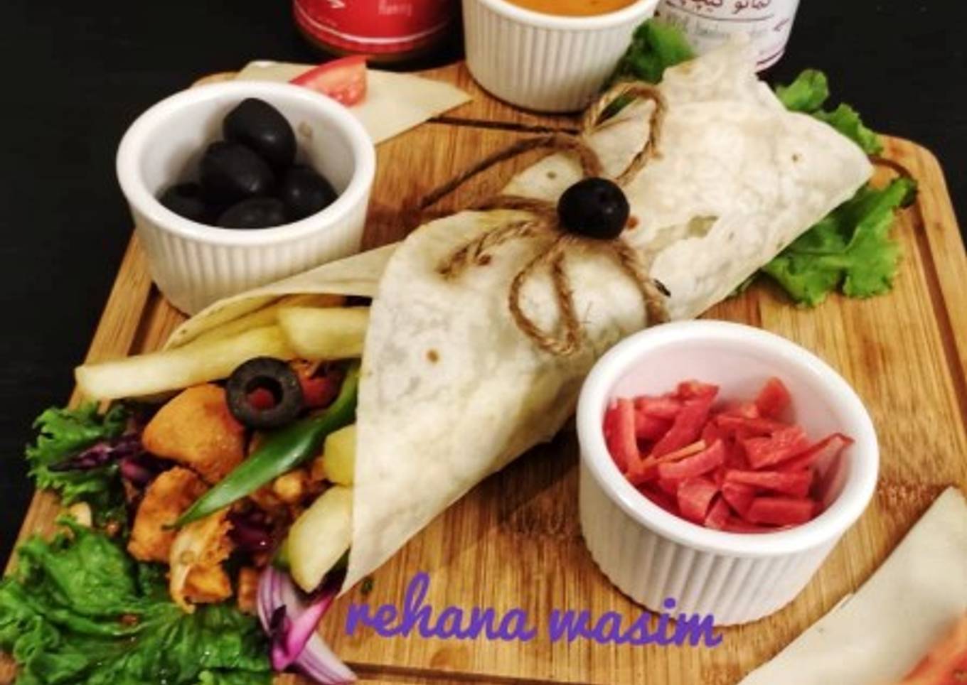 - Now heat tortillas and fill up with chicken, sauces, veggies, fries and cheese, fold it. Serve with ketchup. or Peri sauce.