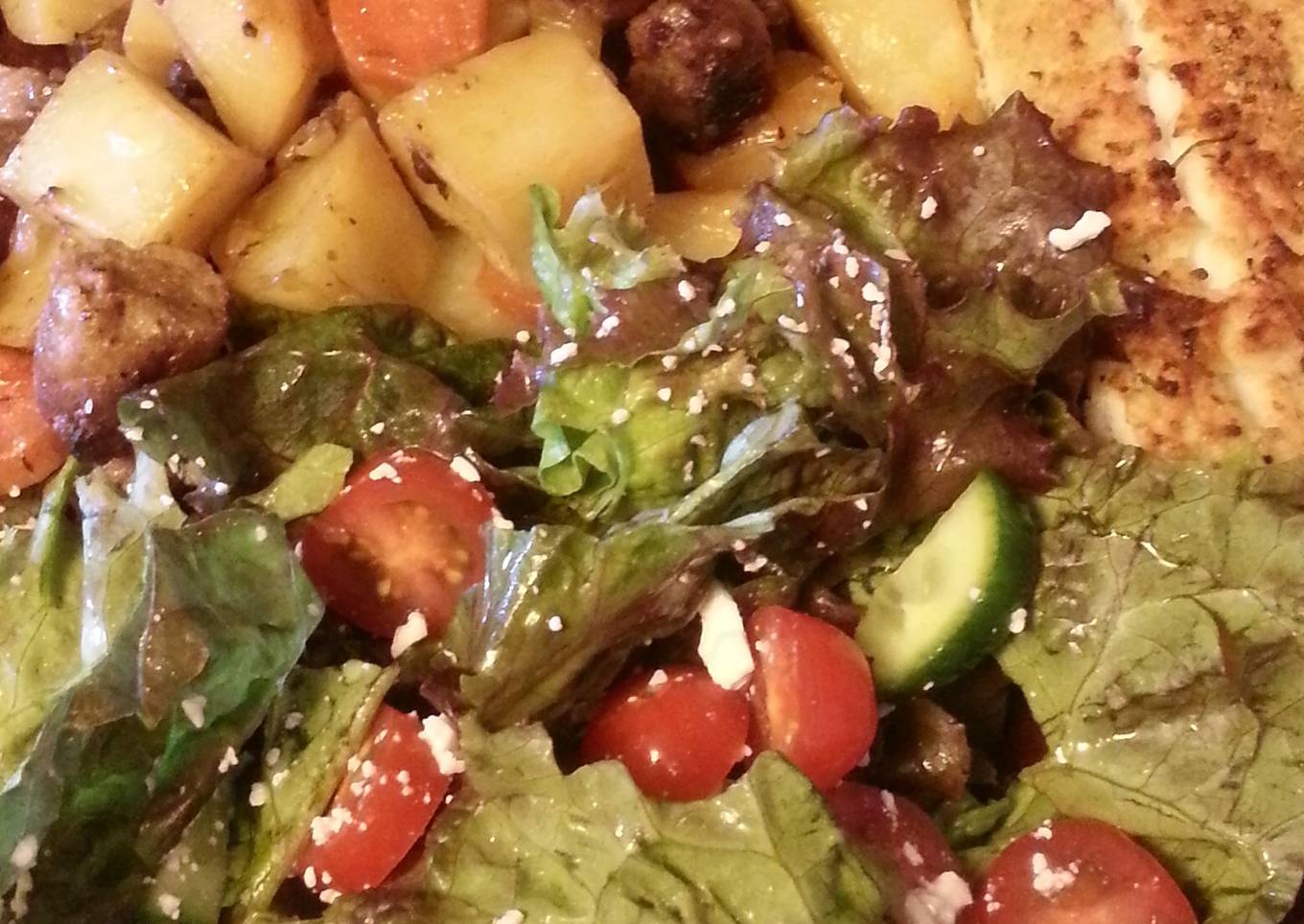 - In large bowl Mix potatoes, sausage, beef broth, onions, carrots, salt and pepper, Italian herb seasoning, and garlic. Then transfer to large casserole dish.