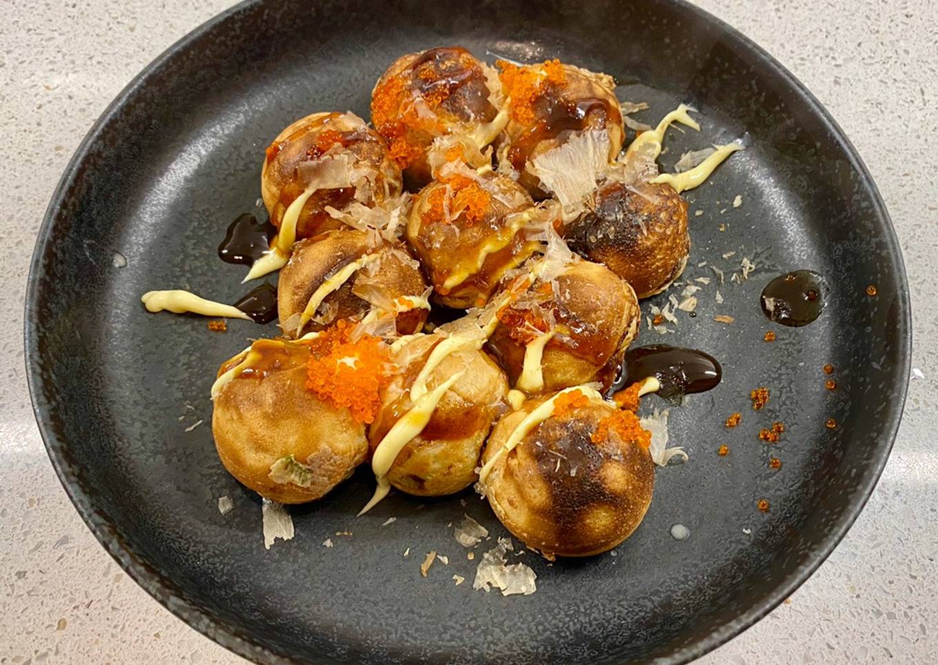 - Once takoyayki is fully cooked, place a few on a serving plates. Garnish and smother them with loads of takoyaki sauce and Japanese mayonnaise. Lastly, sprinkle some bonito flakes and tobiko (optional) on top and enjoy. Serve and eat while hot.